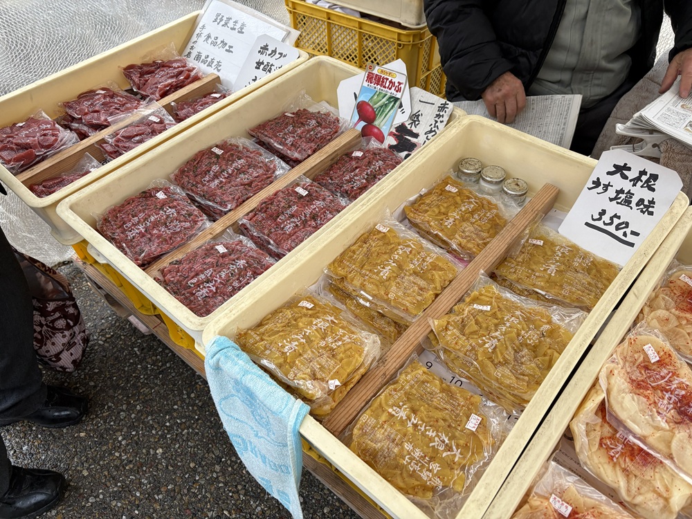 頑張って営業するお父さんのテントで、飛騨高山名物の赤カブの甘酢漬けを購入。