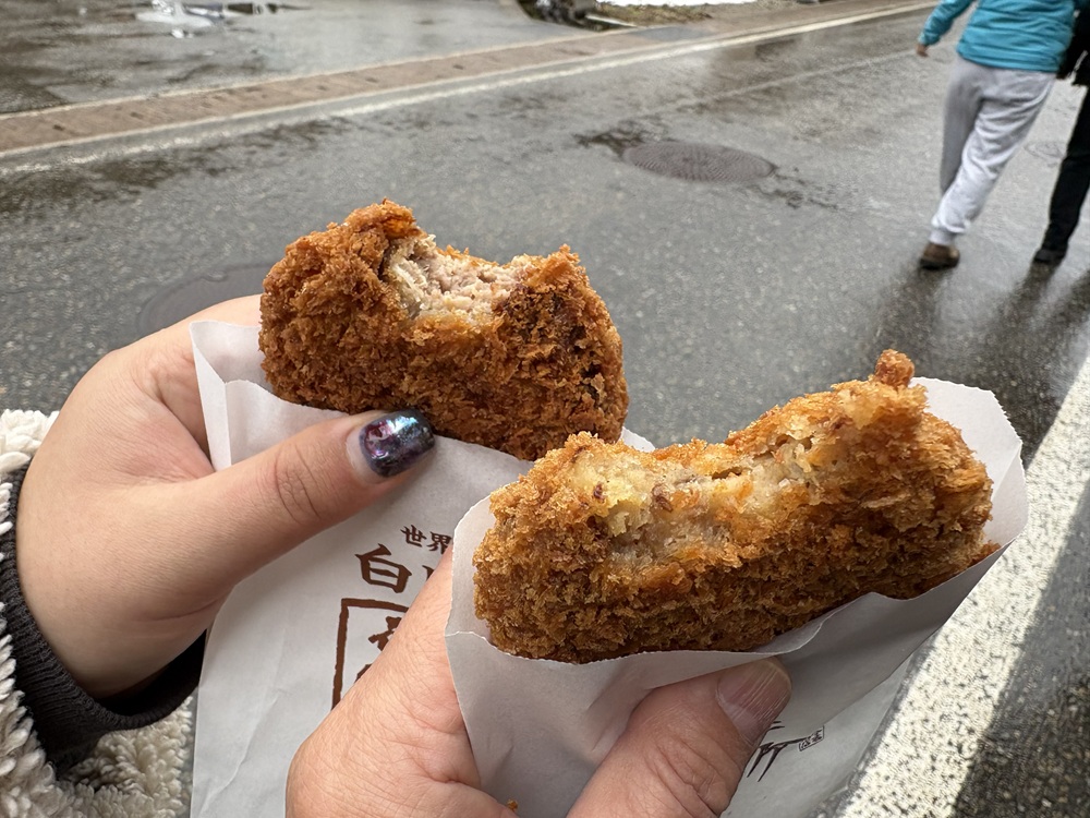 合掌造り民家園の入口で飛騨牛メンチカツをおかわり!?
