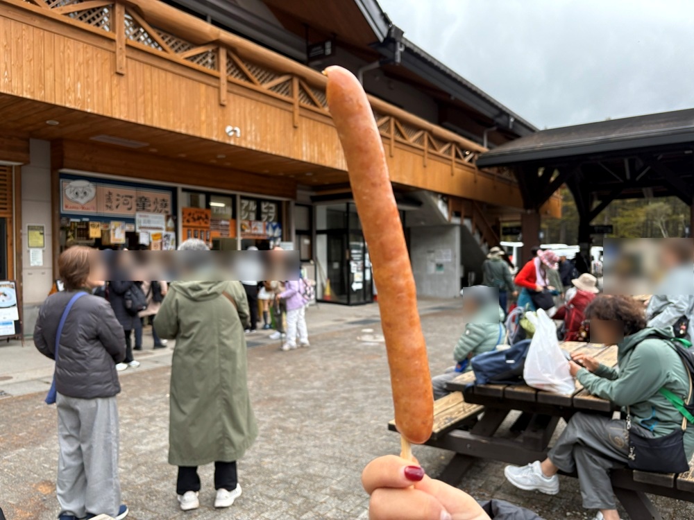 「上高地アルピコショップ」で購入したフランクフルトとそばおやきがめちゃめちゃおいしいです。帰りもまだ売店が開いていたらここでまたお焼きをお土産に買って帰ろうと心に誓い、トイレに立ち寄ってから出発!