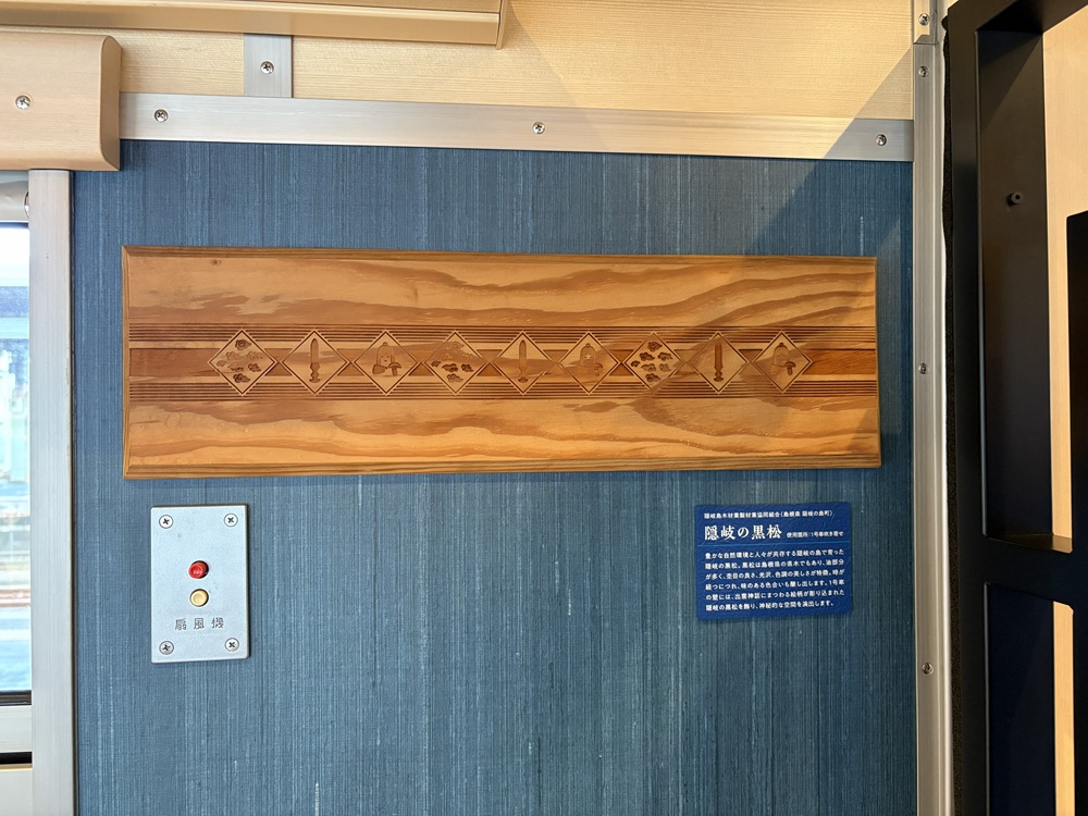 電車の中は木目調のパネルを多用して白木の質感を表現。壁面や床の色は山陰の山や日本海を表現しています。