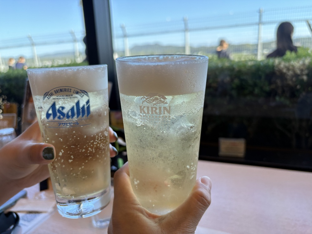 めったに離発着しない飛行機!?を眺めながら泡たっぷりのハイボールを飲んで乾杯。小娘は重度の中耳炎を患っているのに飛行機に乗るっていう恐怖をアルコールで麻痺させます。