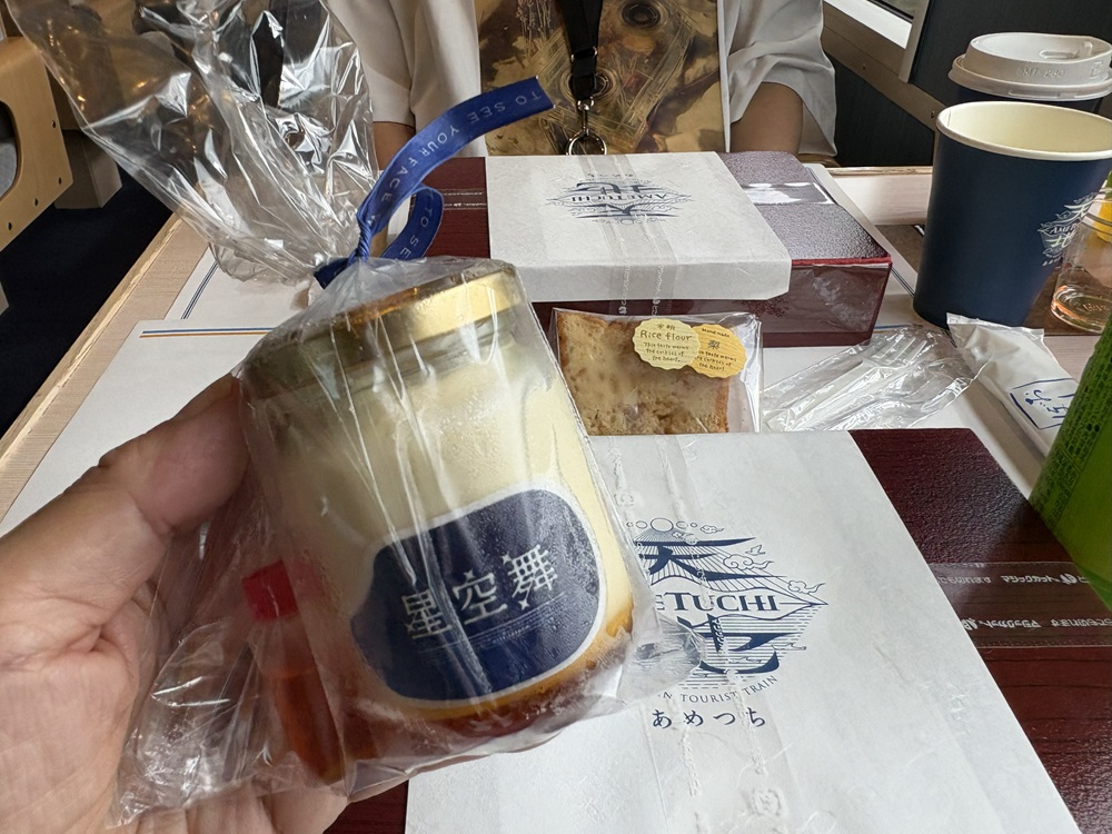 要冷蔵のシフォンケーキとプリンだけ車内でいただき、残りはお土産として持ち帰りました。鳥取名産の梨を使ったシフォンケーキは米粉の風味としっとり柔らかな食感でおいしい。